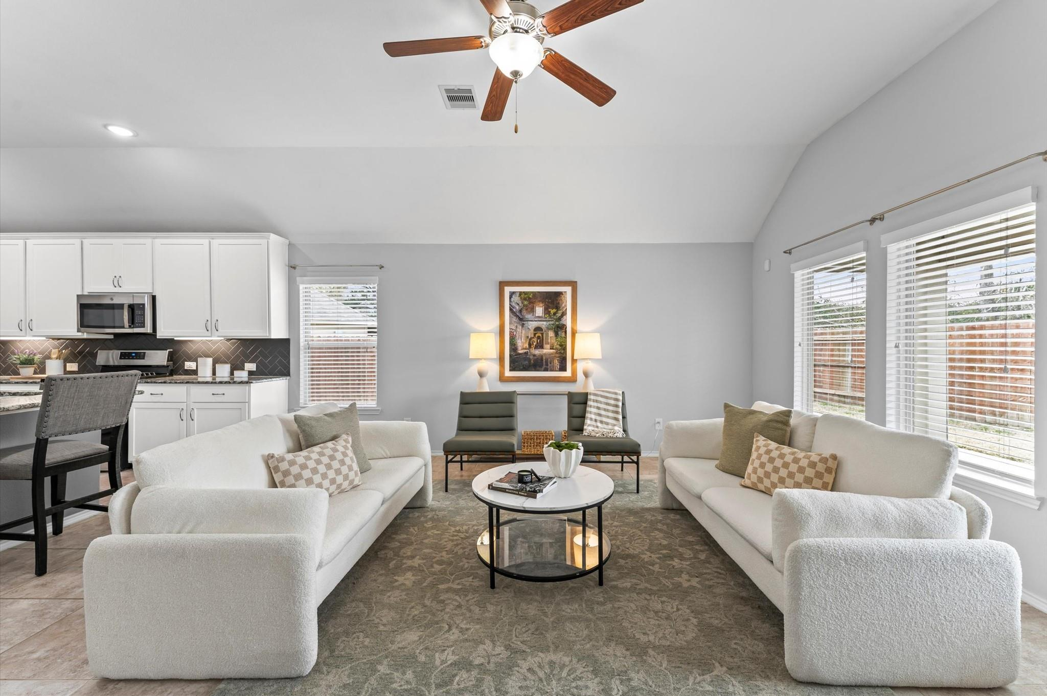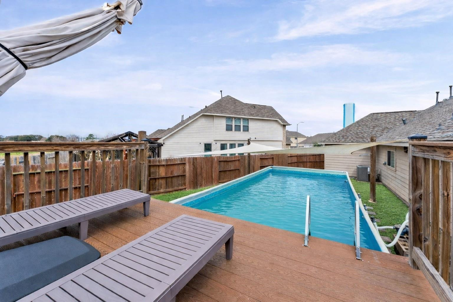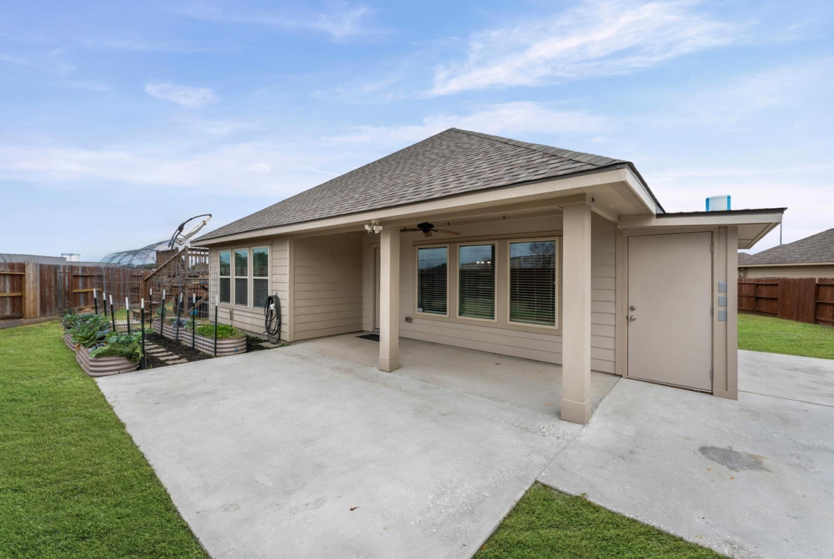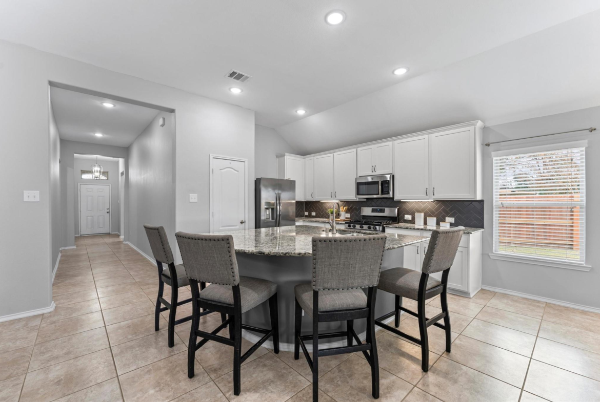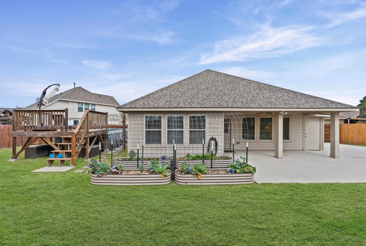 Elegant design and generously sized, this home rests on a large lot and showcases an open floor plan. Tile flooring flows throughout the main living areas, creating a clean, cohesive look with easy maintenance. The island kitchen is a standout, with its granite countertops, a breakfast bar, maple cabinetry, and stainless steel appliances, including the refrigerator. The split floor plan enhances privacy and flexibility. Secondary bedrooms are positioned toward the front of the home, with 2 of them sharing access to one full bath, while a middle bedroom across the hall accesses a separate full bath. A dreamy primary suite is tucked away in the back. Step outside to an oversized backyard built for enjoyment, featuring a covered patio, raised garden beds, an above-ground pool with deck, and plenty of space to relax or play. Recent updates include a new roof in 2024 and a whole-house water softener and filtration system. This beauty is a perfect blend of space, comfort, and functionality.