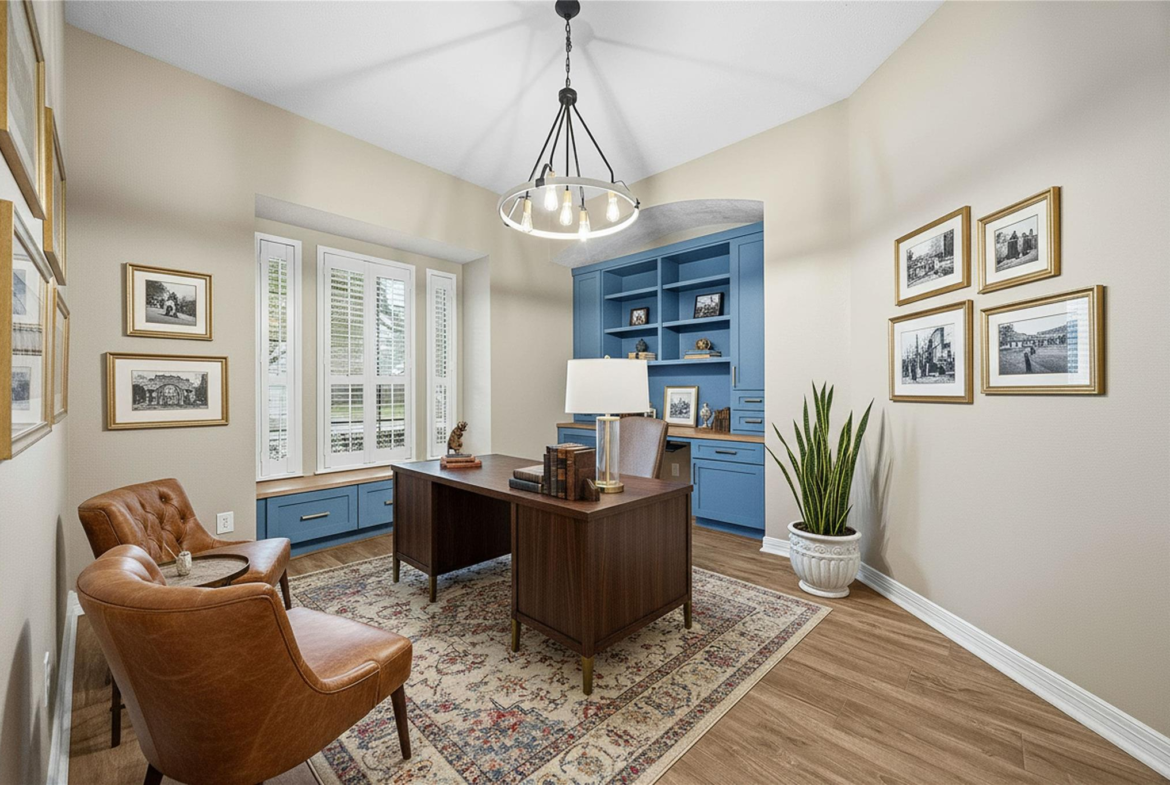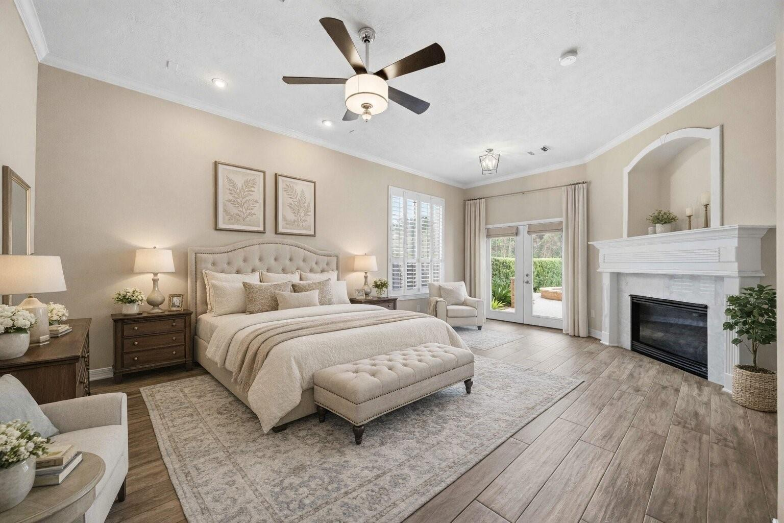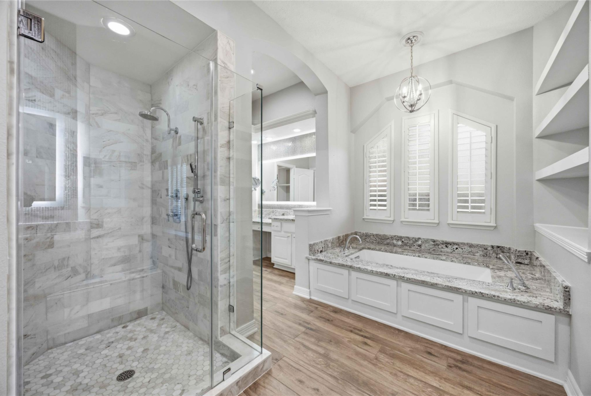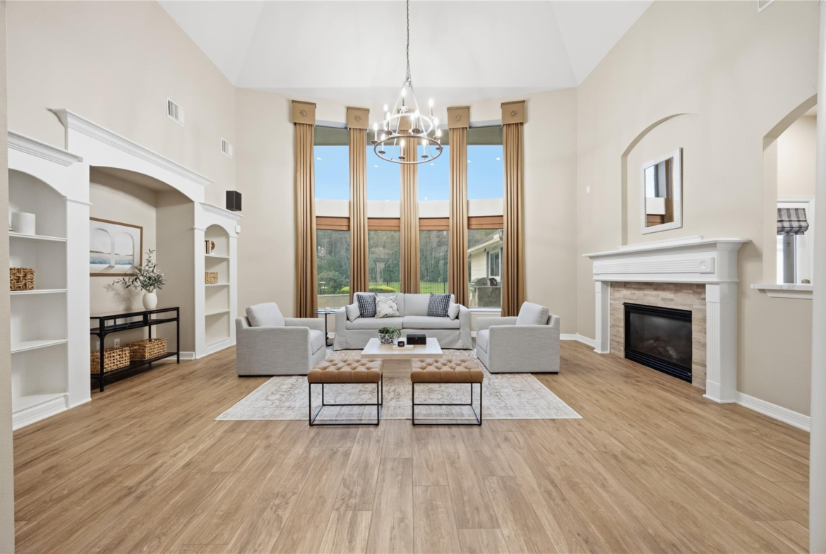 Beautifully updated home with no back neighbors and peaceful green space views. The entry opens to a remodeled office with custom desk and shelving and a remodeled kitchen designed for everyday living and entertaining. The spacious primary suite features a sitting area with fireplace, while the remodeled primary bath includes a marble shower, lighted mirrors, and custom closets. Wood-look ceramic tile runs throughout the first floor with LVP on the stairs and upstairs common areas. Upstairs offers a remodeled media room, large gameroom, secret storage room, and three generous secondary bedrooms. The backyard retreat features a heated pool and hot tub, covered patio, three-car garage, and walking distance to the neighborhood pond for fishing, feeding ducks, or relaxing strolls.