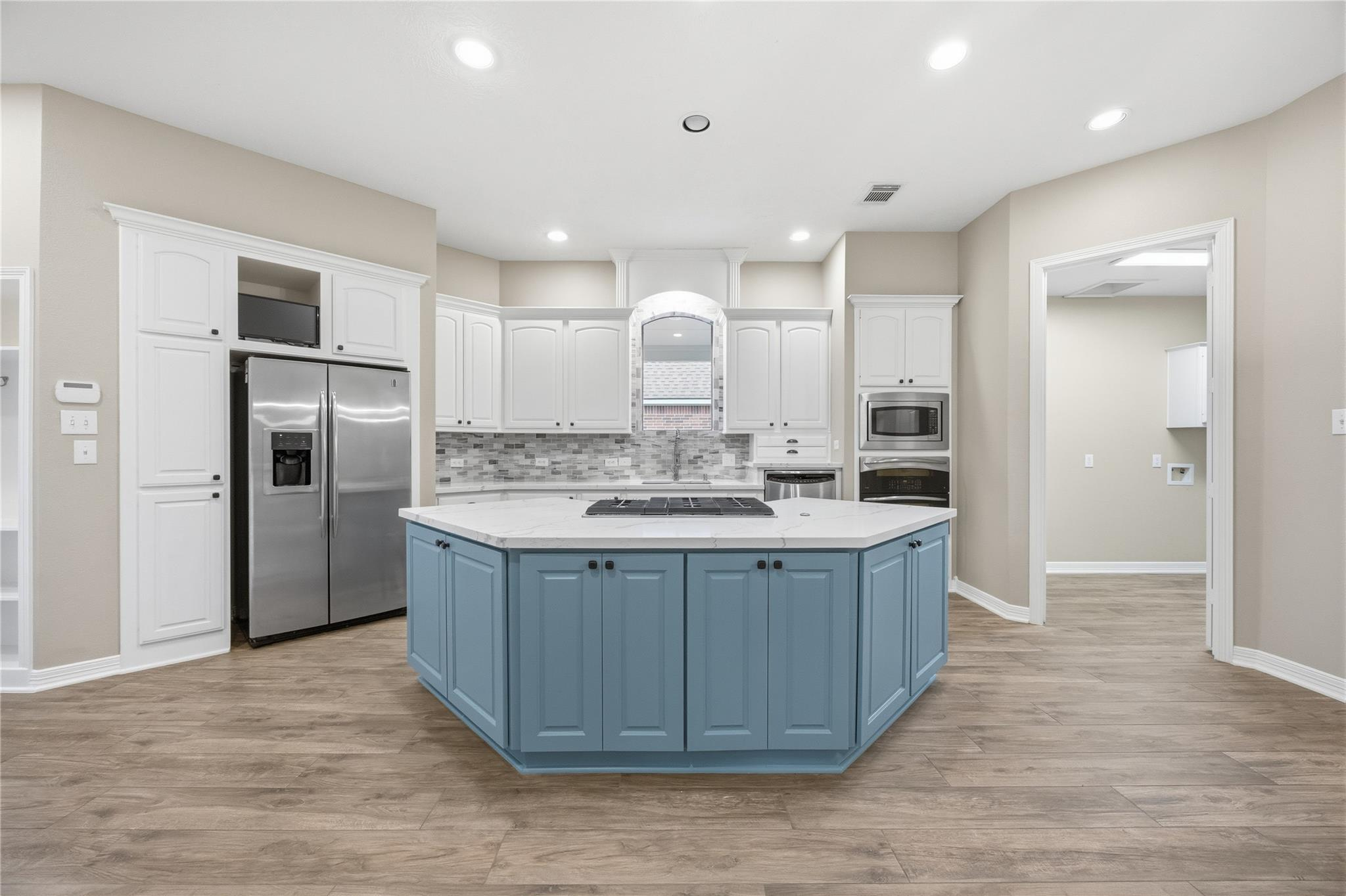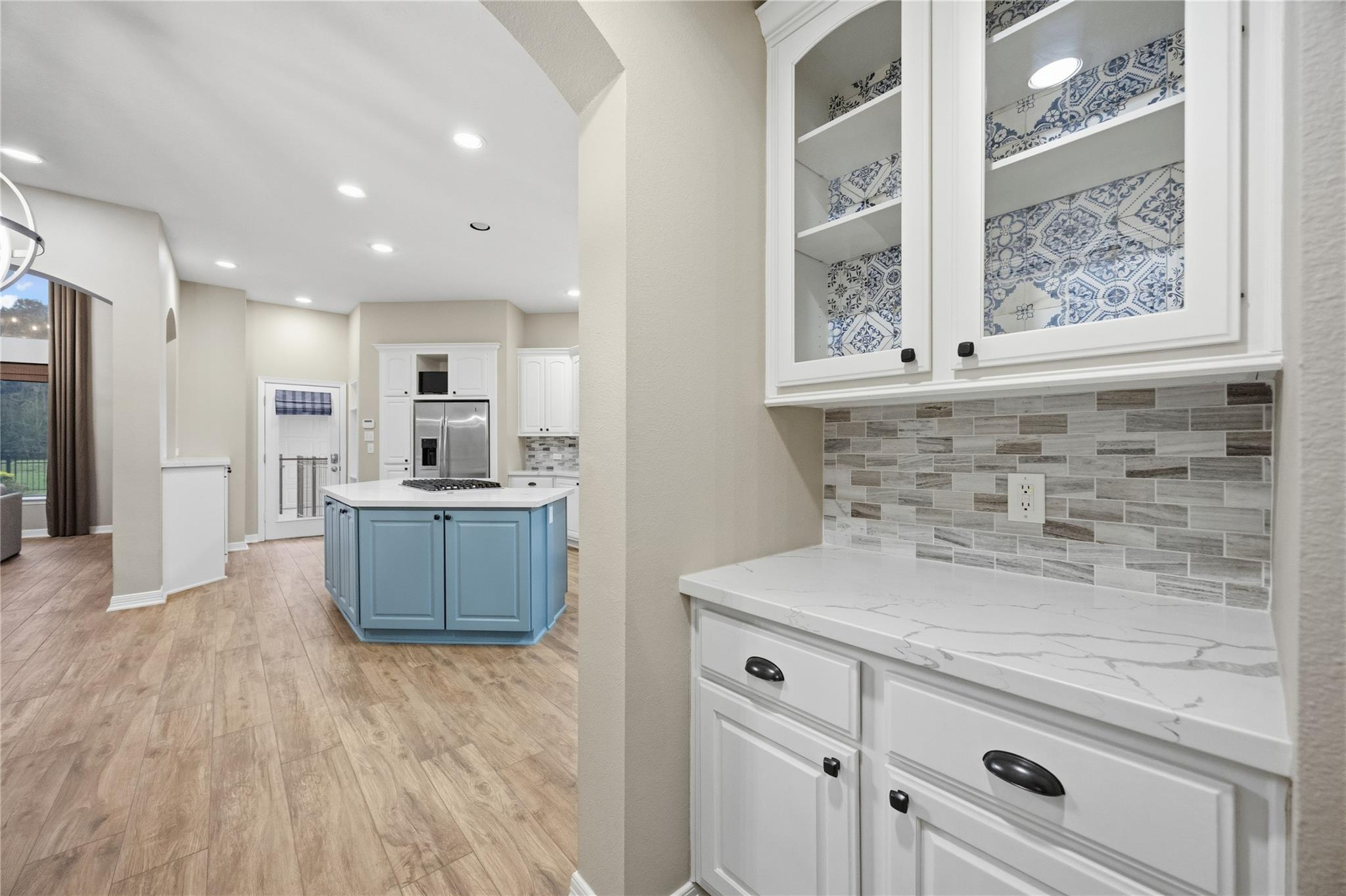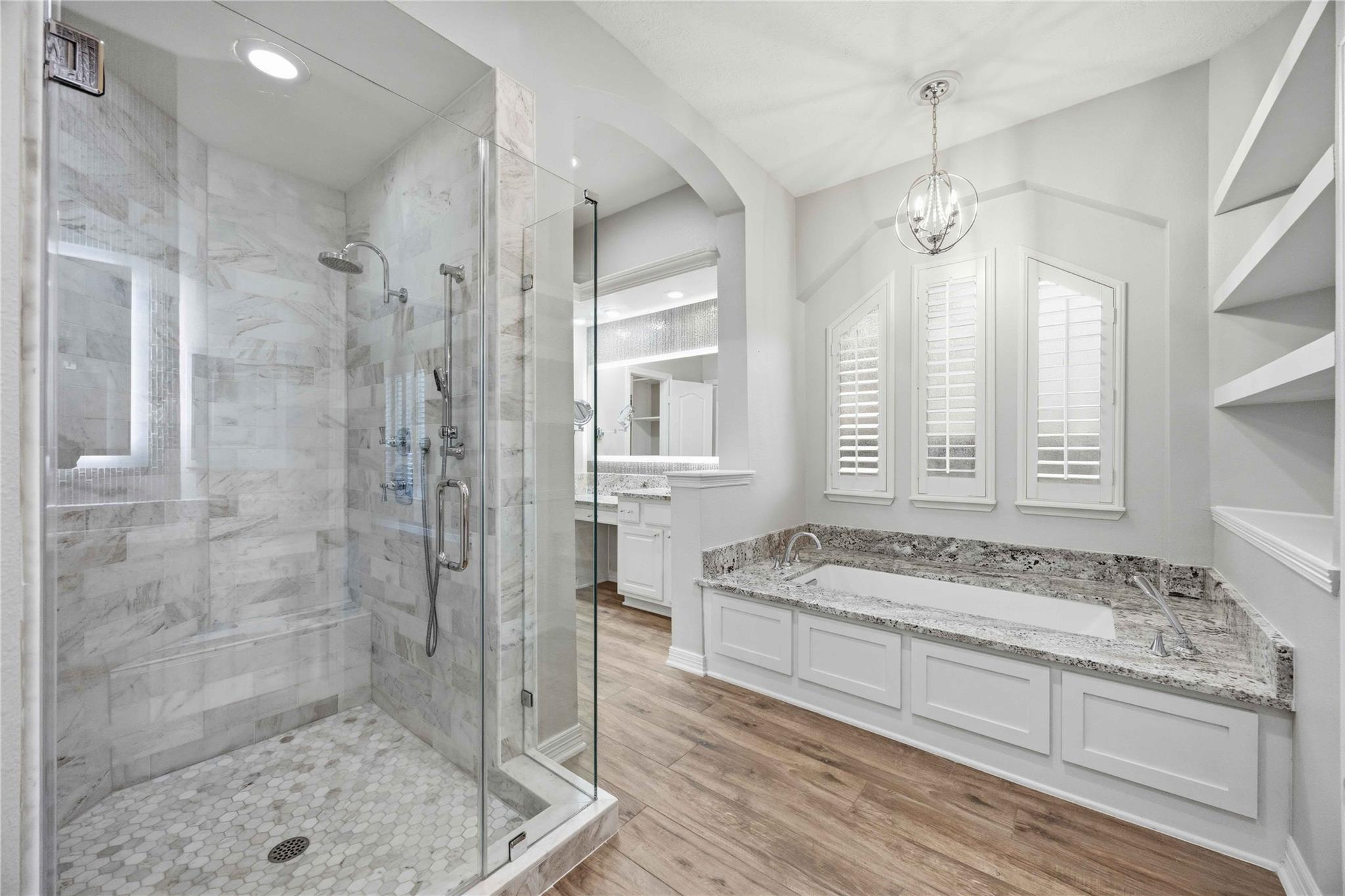 Beautifully updated home with no back neighbors and peaceful green space views. The entry opens to a remodeled office with custom desk and shelving and a remodeled kitchen designed for everyday living and entertaining. The spacious primary suite features a sitting area with fireplace, while the remodeled primary bath includes a marble shower, lighted mirrors, and custom closets. Wood-look ceramic tile runs throughout the first floor with LVP on the stairs and upstairs common areas. Upstairs offers a remodeled media room, large gameroom, secret storage room, and three generous secondary bedrooms. The backyard retreat features a heated pool and hot tub, covered patio, three-car garage, and walking distance to the neighborhood pond for fishing, feeding ducks, or relaxing strolls.