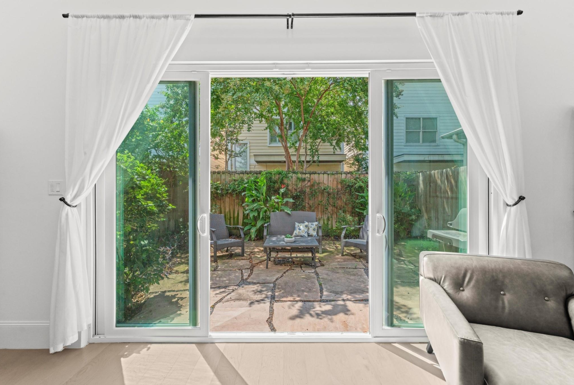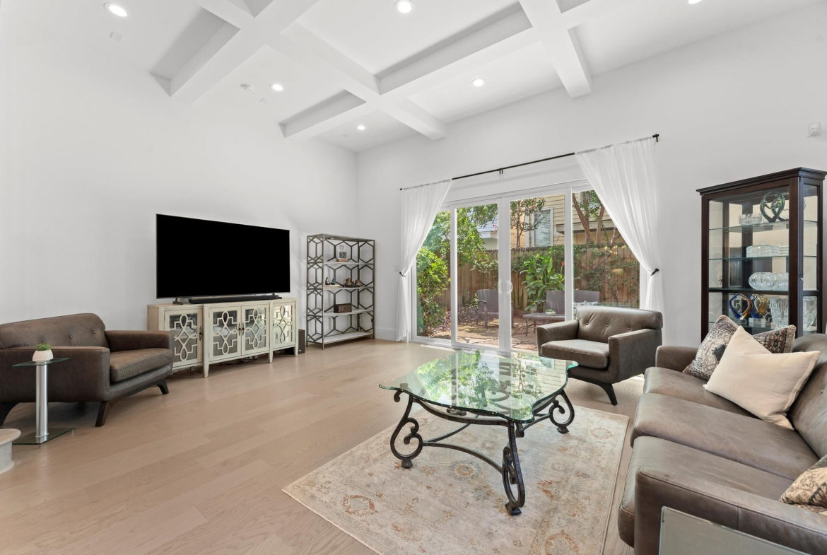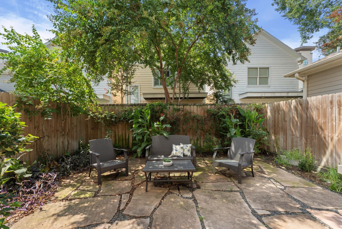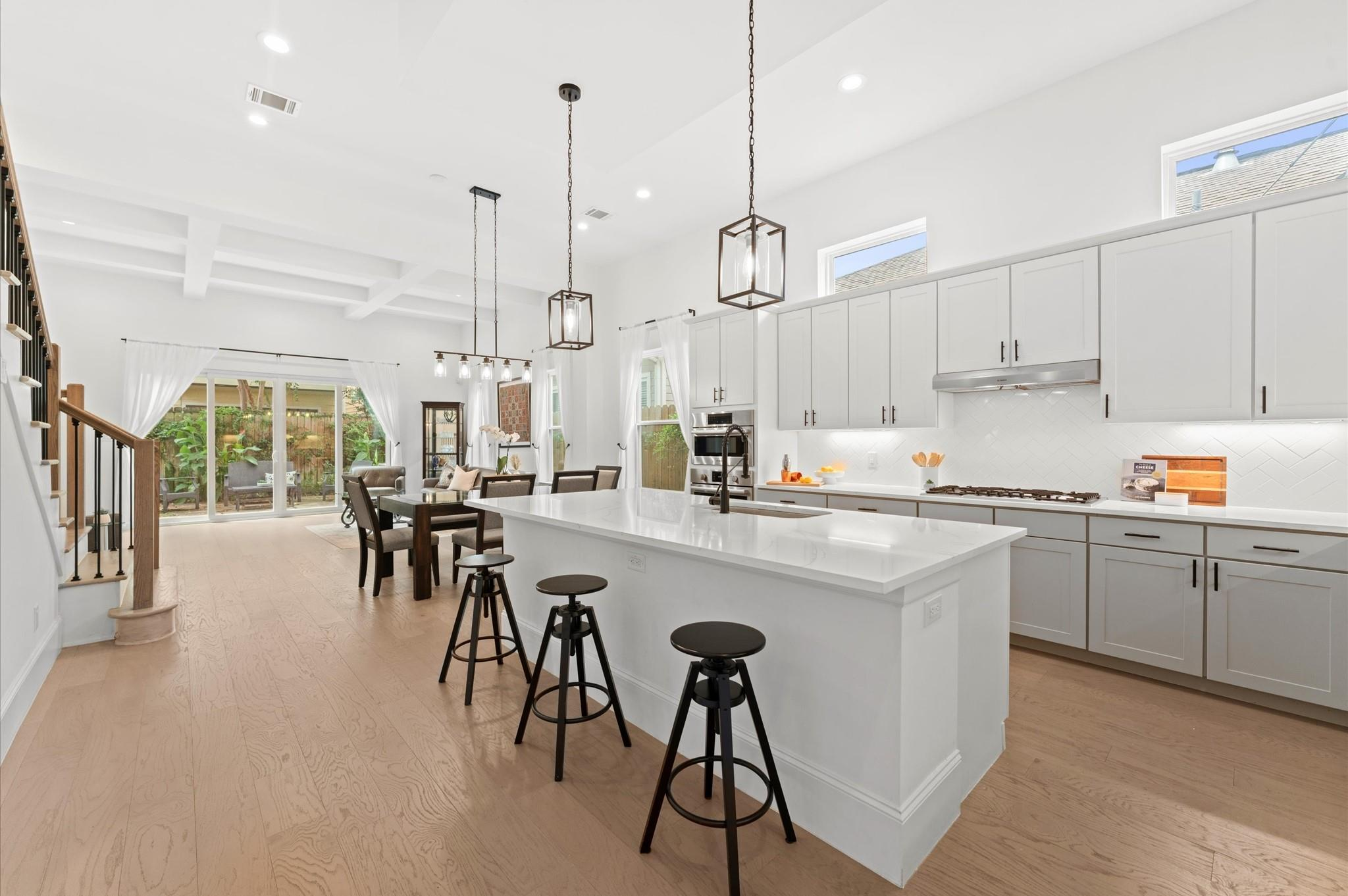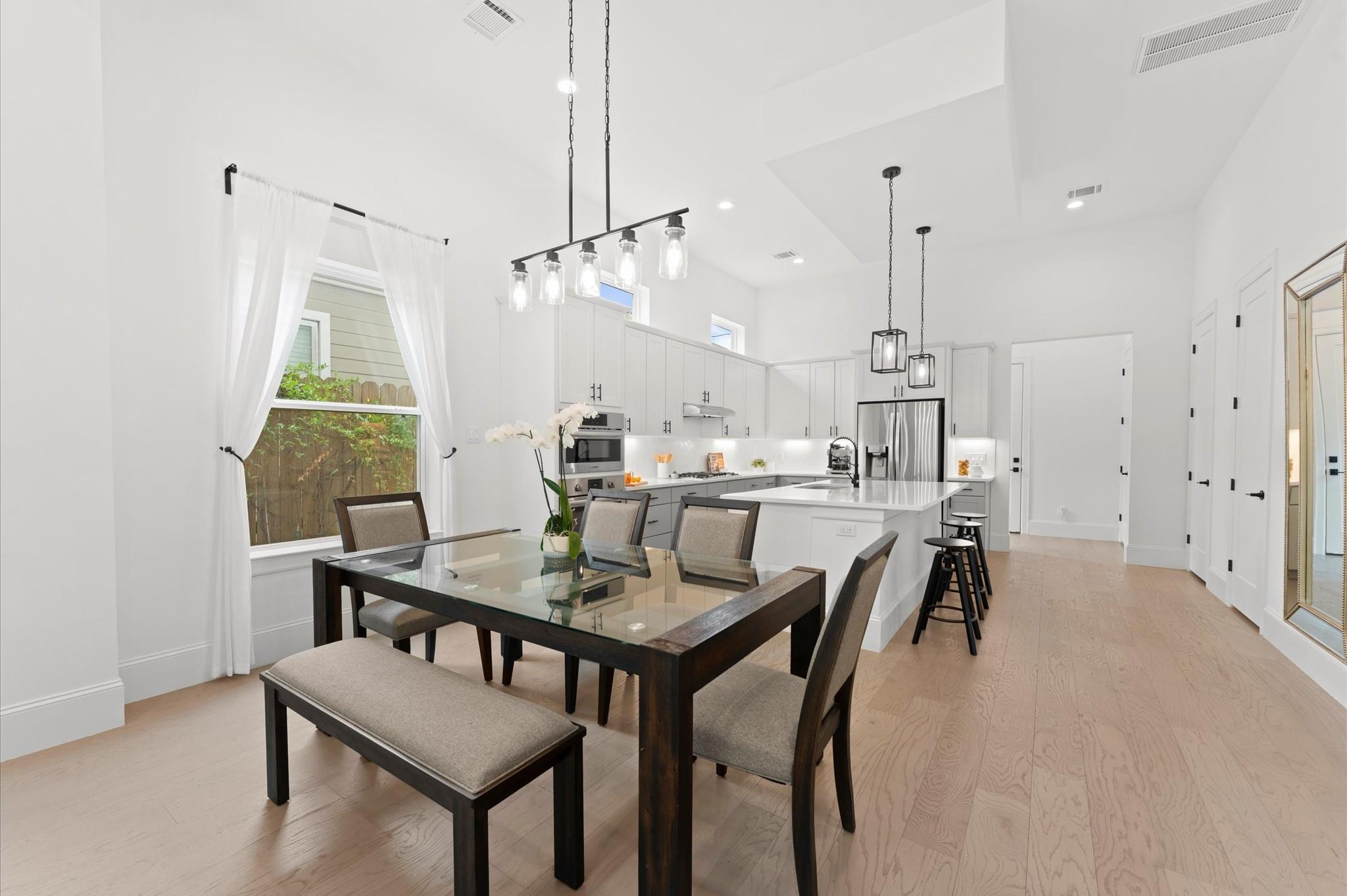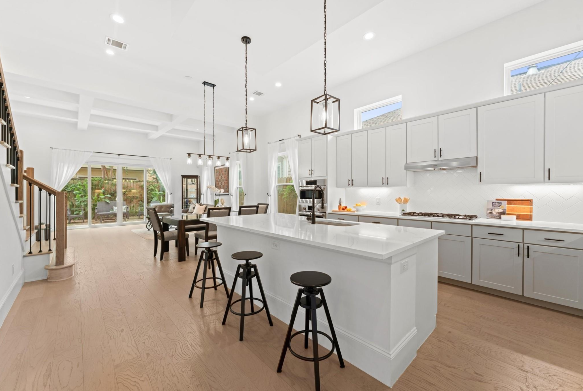 Contemporary beauty meets timeless comfort in this Heights home. Enjoy a gated side entry and a charming back patio finished with flagstone pavers. Inside, engineered wood floors flow throughout an open floor plan that connects the living, dining, and kitchen areas. The living room impresses with a high, coffered ceiling and sliding glass doors that open to an inviting outdoor living space. A desirable Island kitchen rests below a high ceiling and offers ample cabinets with under-lighting, stainless steel appliances, and a built-in wine fridge. A wooden staircase leads to the 2nd floor, where you’ll find three bedrooms and two full baths. The primary suite features a tray ceiling and a sitting area. Its luxurious bath includes a frameless shower, a soaking tub, a dual-sink vanity, and a large walk-in closet with built-in drawers and shelving. Two additional bedrooms share a Hollywood bath with dual vanities and a tub/shower combo, while a 2nd-floor utility room provides convenience.