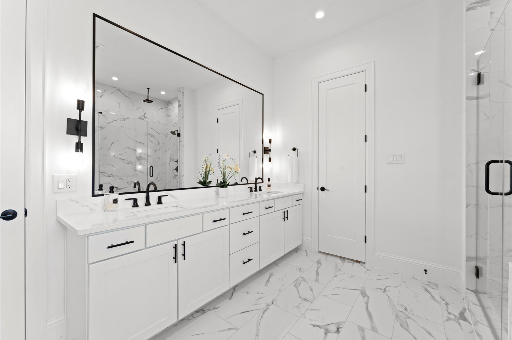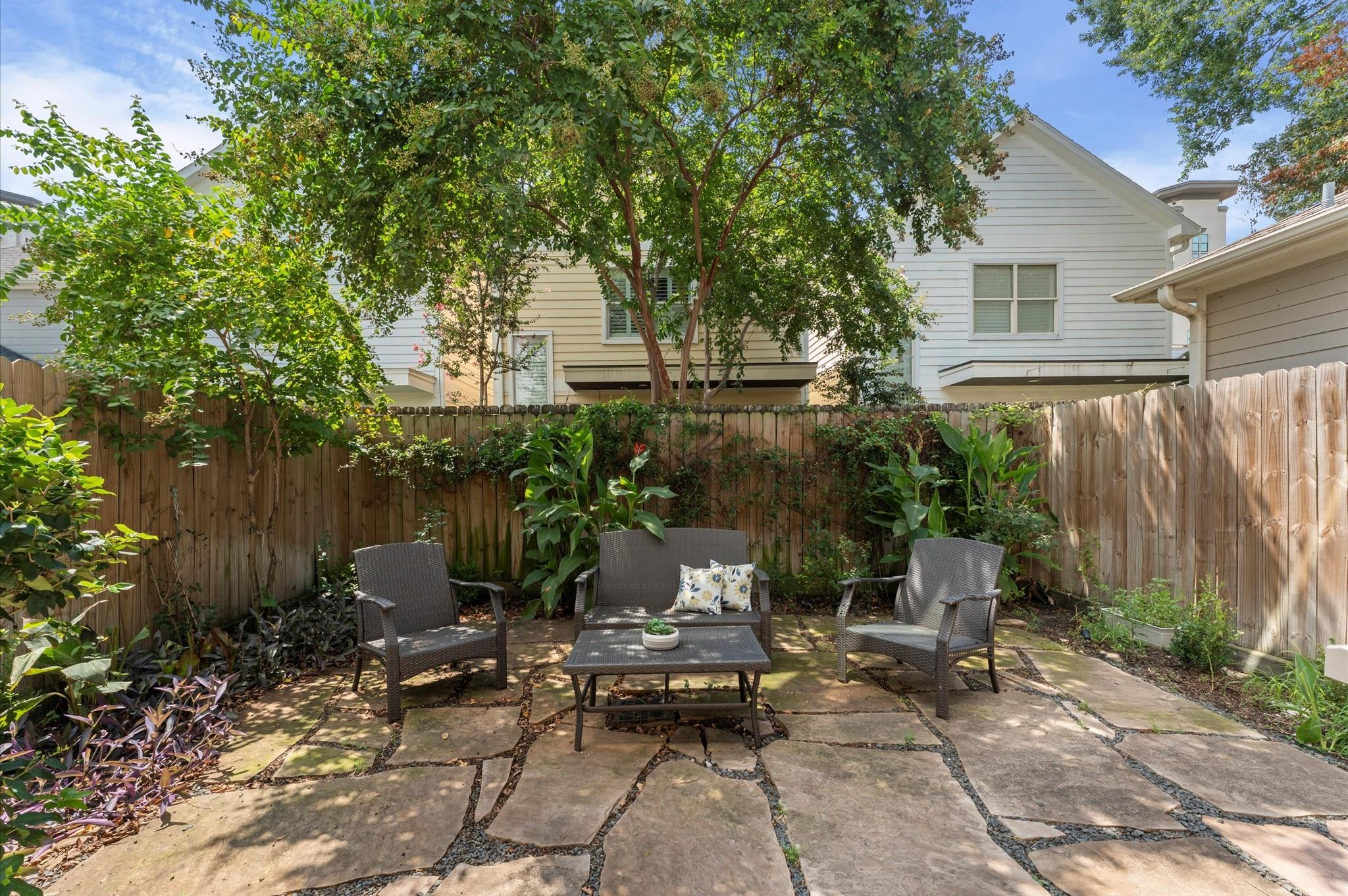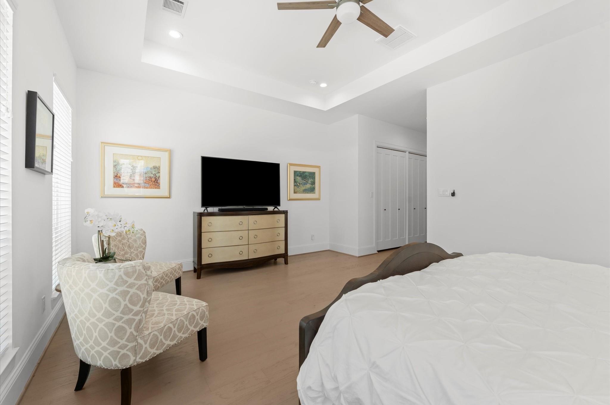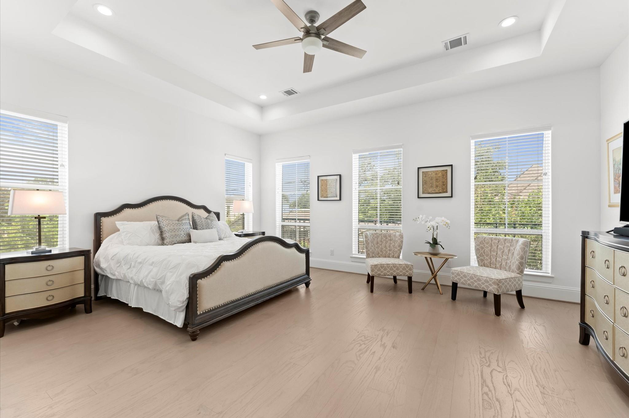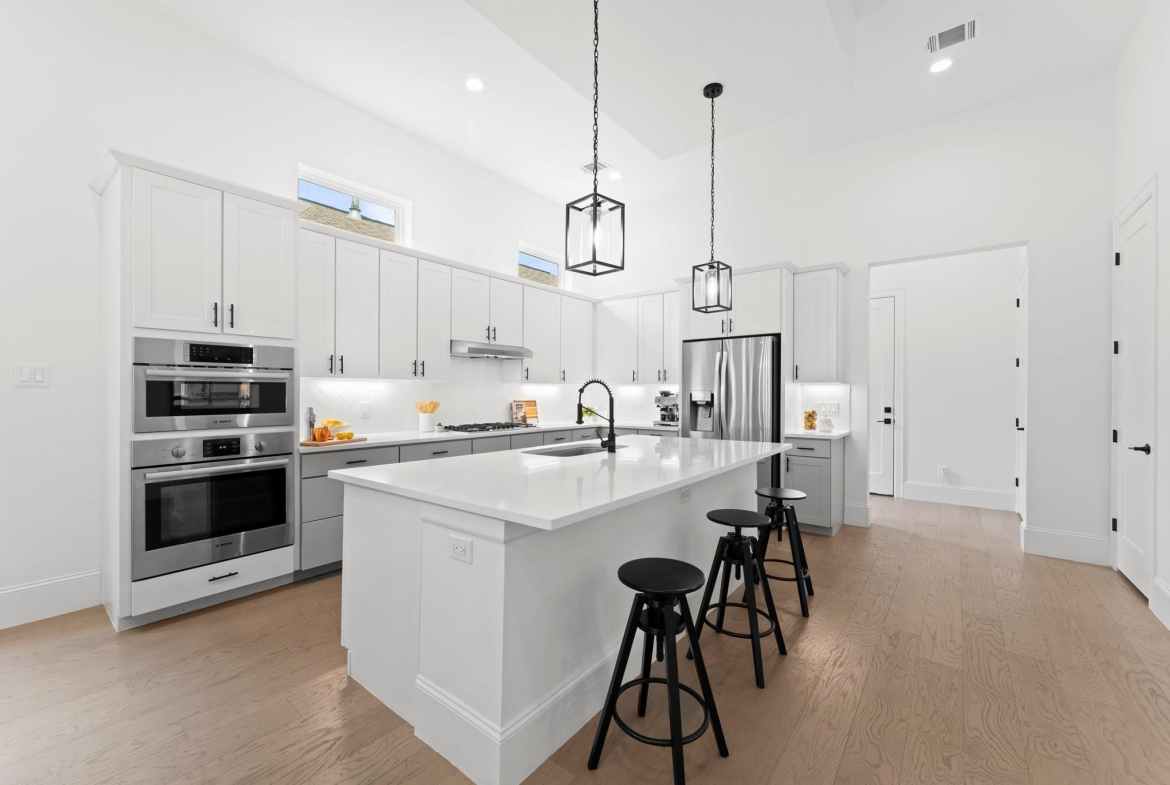 Contemporary beauty meets timeless comfort in this Heights home. Enjoy a gated side entry and a charming back patio finished with flagstone pavers. Inside, engineered wood floors flow throughout an open floor plan that connects the living, dining, and kitchen areas. The living room impresses with a high, coffered ceiling and sliding glass doors that open to an inviting outdoor living space. A desirable Island kitchen rests below a high ceiling and offers ample cabinets with under-lighting, stainless steel appliances, and a built-in wine fridge. A wooden staircase leads to the 2nd floor, where you’ll find three bedrooms and two full baths. The primary suite features a tray ceiling and a sitting area. Its luxurious bath includes a frameless shower, a soaking tub, a dual-sink vanity, and a large walk-in closet with built-in drawers and shelving. Two additional bedrooms share a Hollywood bath with dual vanities and a tub/shower combo, while a 2nd-floor utility room provides convenience.