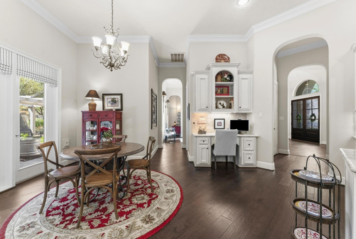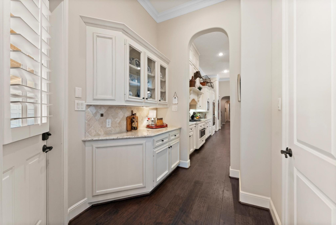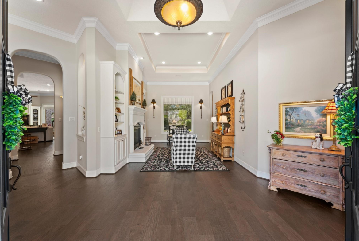 Enjoy refined living in this elegant one-story estate with a FOUR-car garage in the gated Falls at Champion Forest community! A grand entry with high ceilings sets the tone for a light-filled interior, hardwood floors, and timeless finishes. The chef-worthy kitchen features granite counters, a warming drawer, and a nearby wine bar. It overlooks the living area, ideal for day-to-day living, and is close to the dining room and sitting room. The split floor plan offers privacy for the primary suite, which has a garden tub, a walk-in shower, and a custom walk-in closet. A second suite with private entry rests on the opposite side of the home and is perfect for guests or multigenerational living. Highlights include a study, large secondary bedrooms with walk-in closets, two fireplaces, a covered backyard patio with an outdoor kitchen and remote-controlled solar shades, and an air-conditioned workshop. A Texas basement offers excellent storage or the potential for a game or media room.