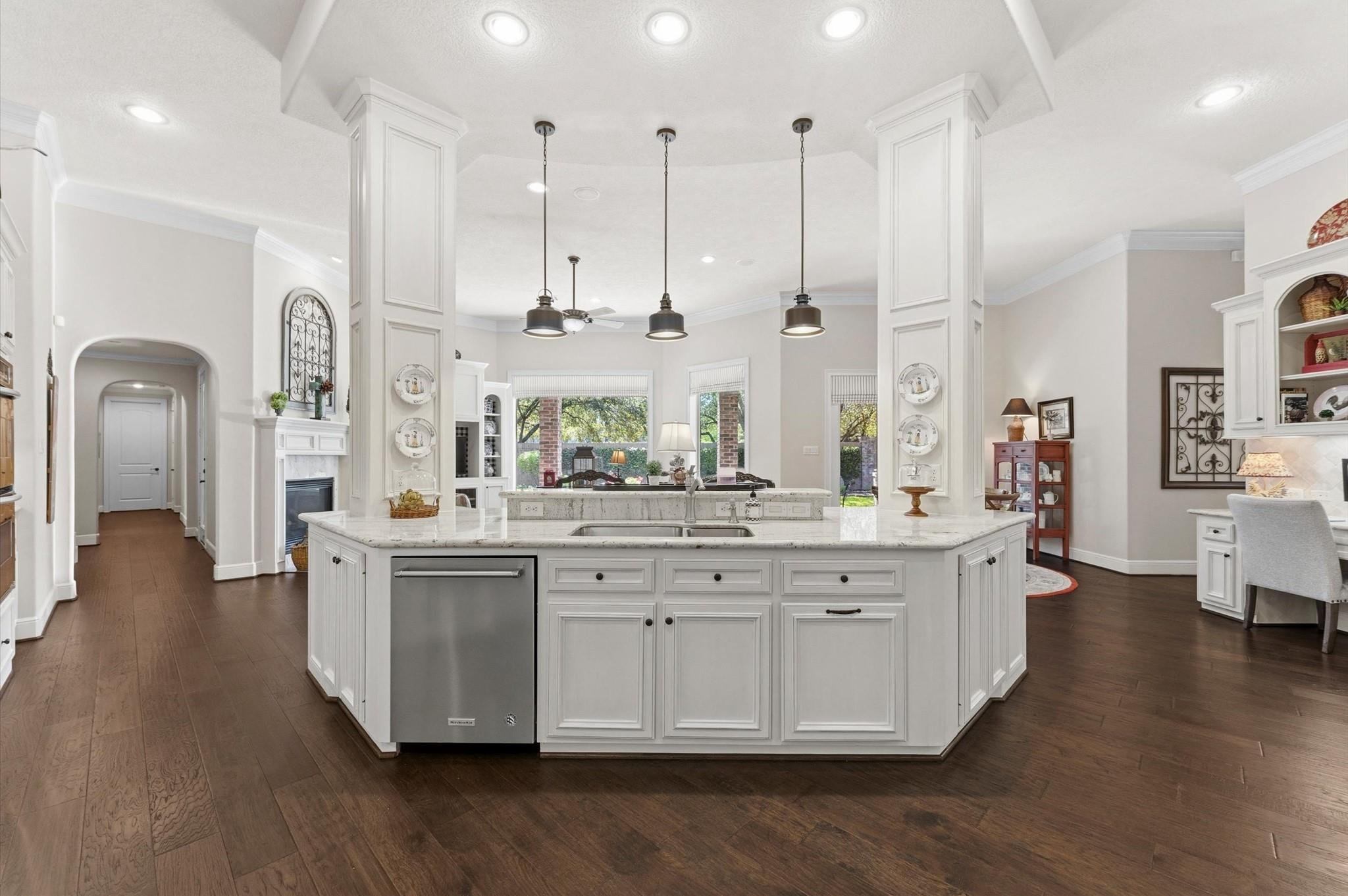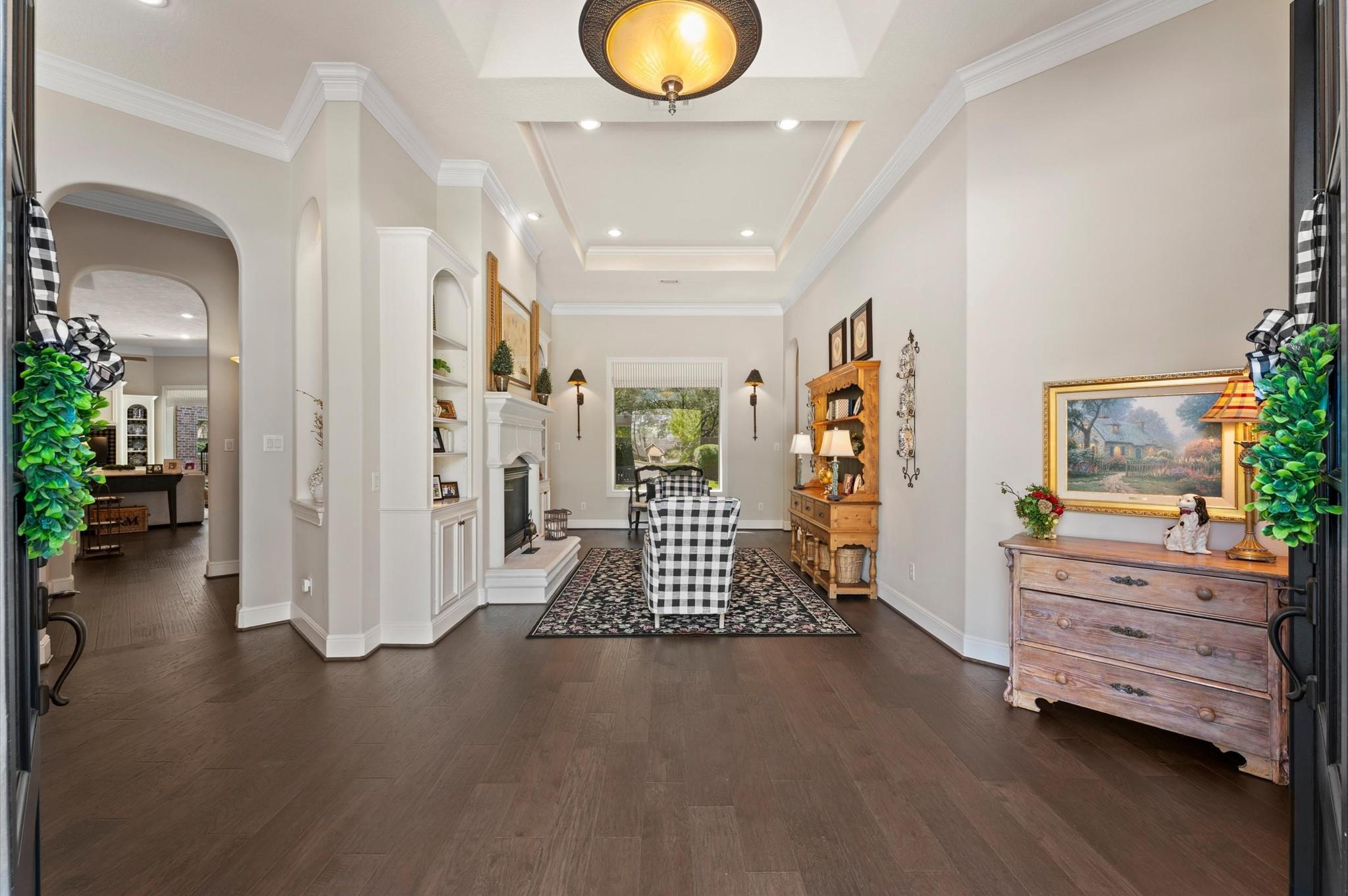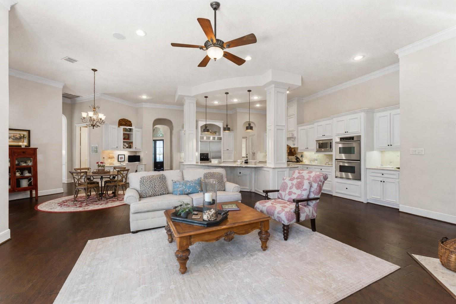Enjoy refined living in this elegant one-story estate with a FOUR-car garage in the gated Falls at Champion Forest community! A grand entry with high ceilings sets the tone for a light-filled interior, hardwood floors, and timeless finishes. The chef-worthy kitchen features granite counters, a warming drawer, and a nearby wine bar. It overlooks the living area, ideal for day-to-day living, and is close to the dining room and sitting room. The split floor plan offers privacy for the primary suite, which has a garden tub, a walk-in shower, and a custom walk-in closet. A second suite with private entry rests on the opposite side of the home and is perfect for guests or multigenerational living. Highlights include a study, large secondary bedrooms with walk-in closets, two fireplaces, a covered backyard patio with an outdoor kitchen and remote-controlled solar shades, and an air-conditioned workshop. A Texas basement offers excellent storage or the potential for a game or media room.