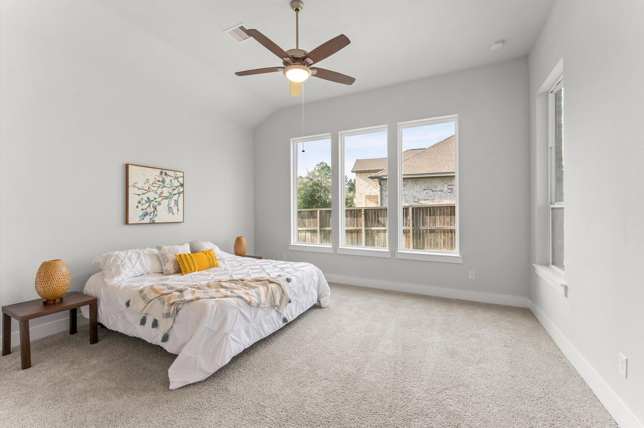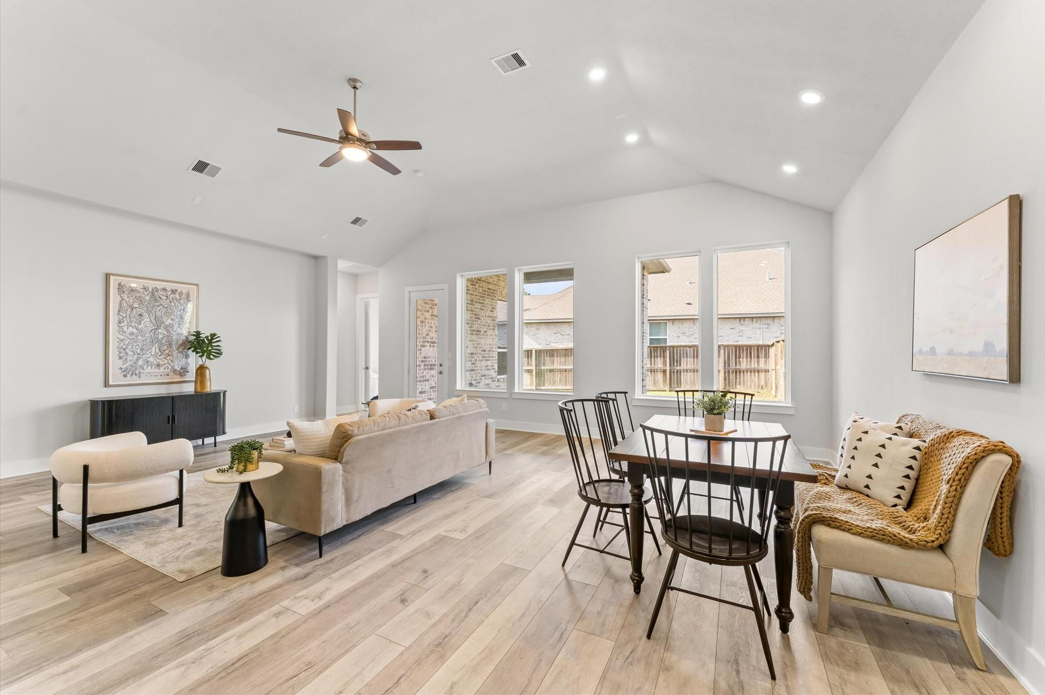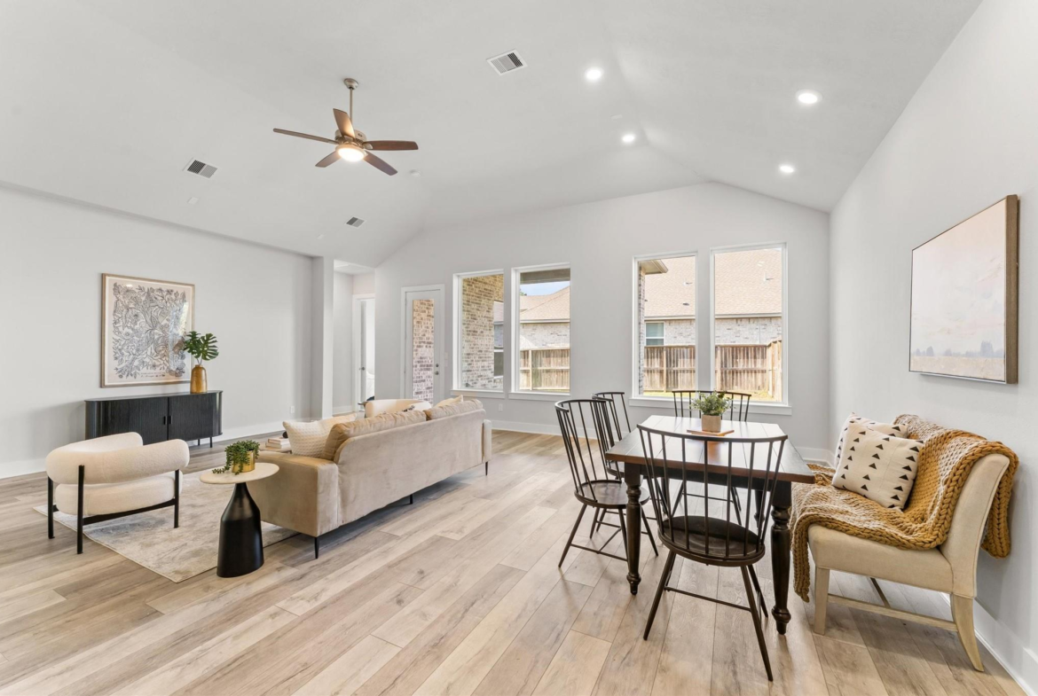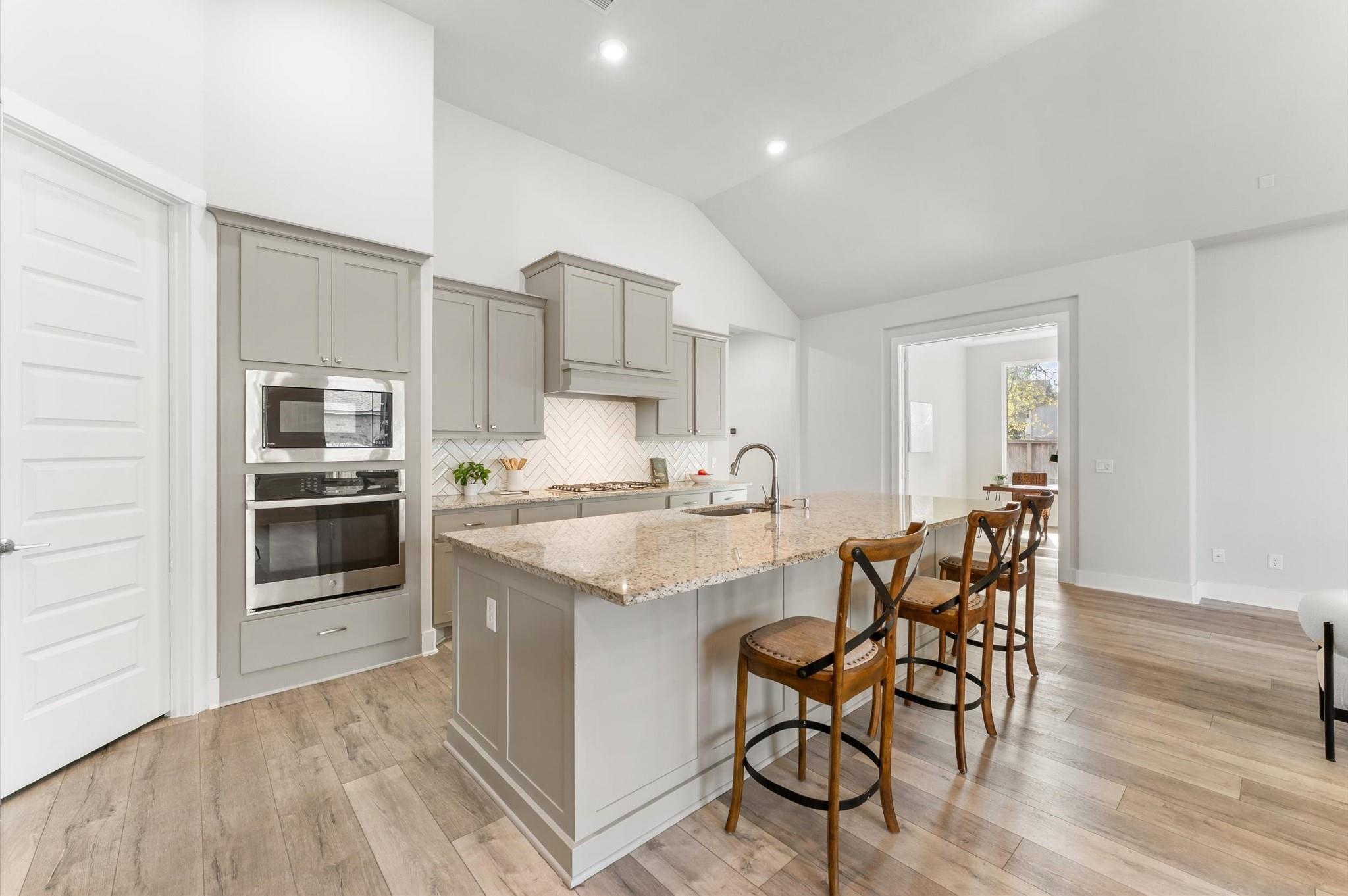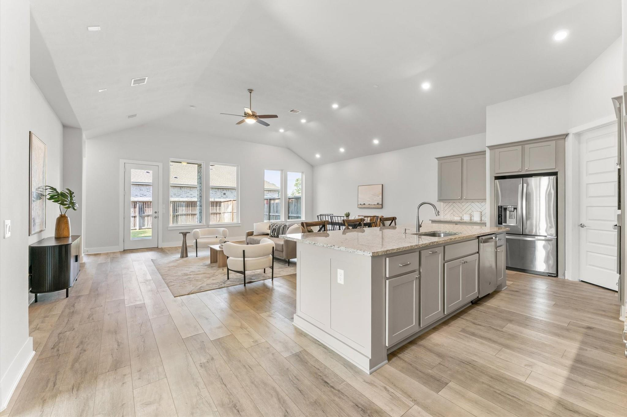 Welcome to this stylish single-story home on a spacious corner lot in The Groves. Beautiful landscaping marks the entry to comfortable living as it offers plenty of space while still giving warm and welcoming vibes. Under a vaulted ceiling, an open family room flows right into the kitchen, making it ideal for entertaining or everyday living. The kitchen really shines with a large island, herringbone tile backsplash, 5-burner gas cooktop, under-mount sink, stainless steel appliances, and a walk-in pantry. Whether you love to cook or just gather around the island, this space delivers! Wood-look laminate flooring runs throughout the main living areas, adding both style and durability. The primary suite is a true escape with dual sinks, a walk-in shower, and a spacious walk-in closet. Step outside to the covered back patio for morning coffee and relaxing evenings while you gaze upon a huge backyard. Neighborhood amenities include an area pool, a lake, and walking paths.