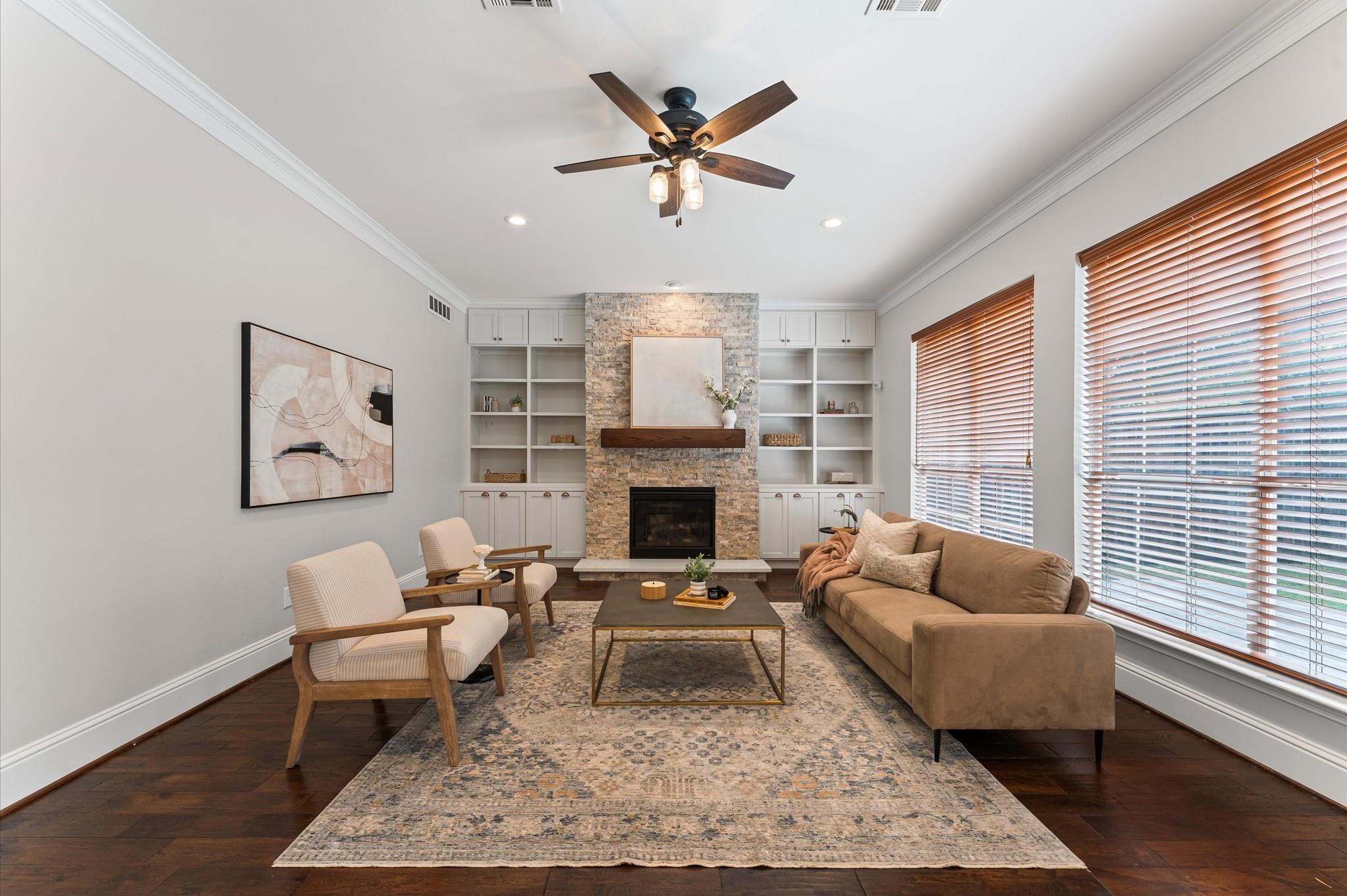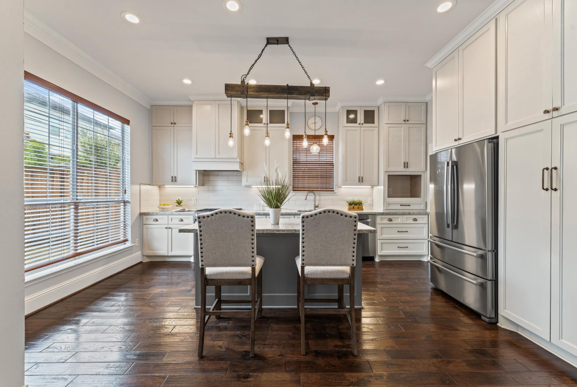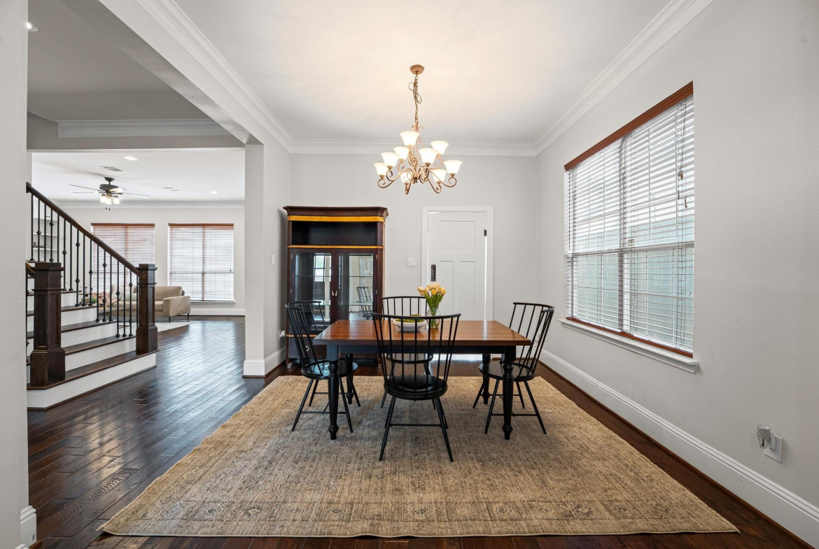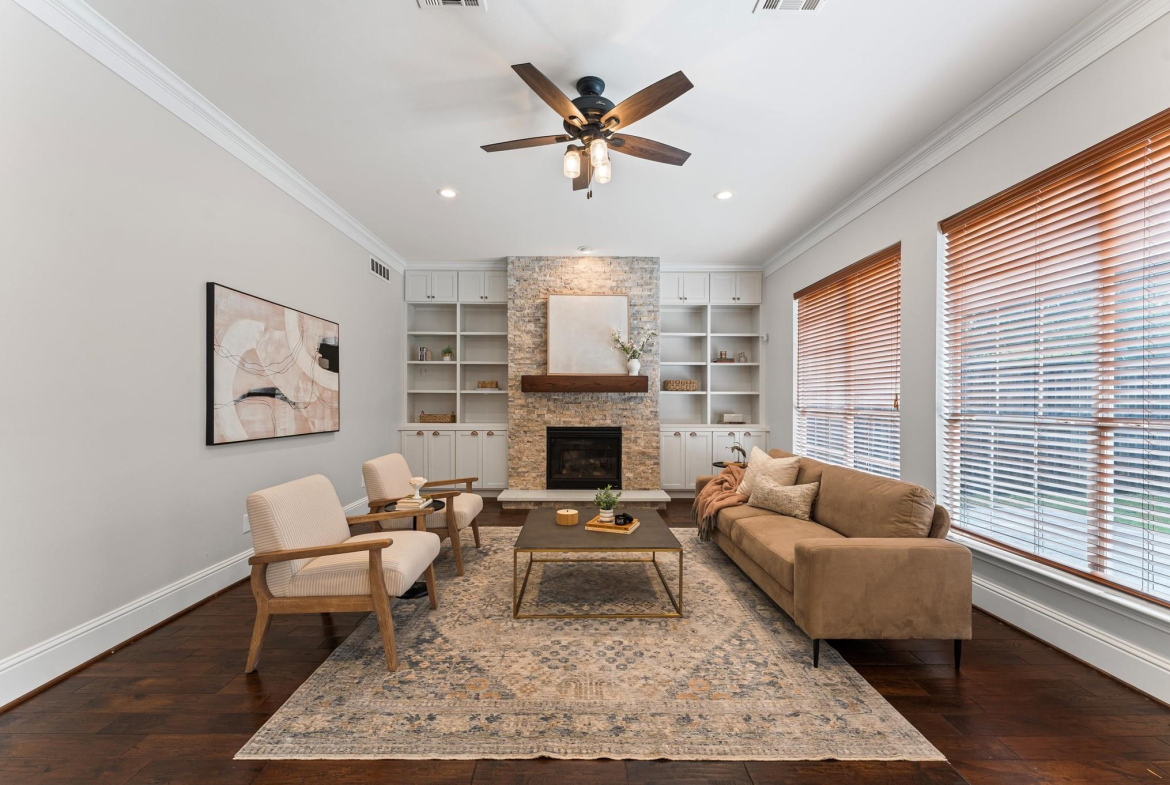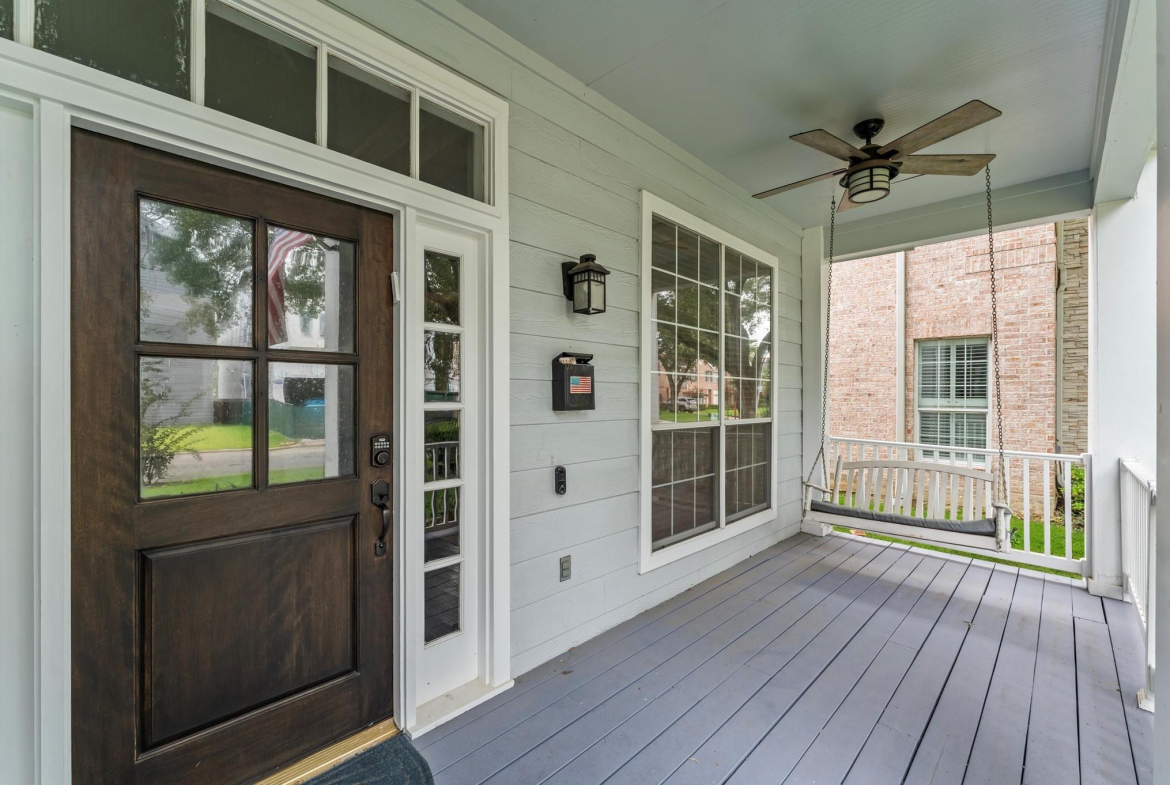 A lovely front porch and upper balcony offer a warm welcome to this gorgeous home. Inside, formal living and dining rooms impress with high ceilings, wood floors, and sleek finishes. A spacious family room features a fireplace with built-ins. It flows into an open kitchen, creating a gathering space ideal for visitors. The kitchen offers granite counters, a gas range, soft-close cabinets, and a large central island. Upstairs, enjoy the primary suite with a vaulted ceiling, a walk-in closet, a jetted tub, and a frameless shower. Three secondary bedrooms include walk-in closets and share a full bath with a separate vanity area. A spacious office can easily serve as a game room or secondary living space where French doors open to the balcony. The backyard boasts an extended patio overlooking a generous lawn – a peaceful setting for outdoor living and entertaining. Call today to see how we can make this house YOUR next home!