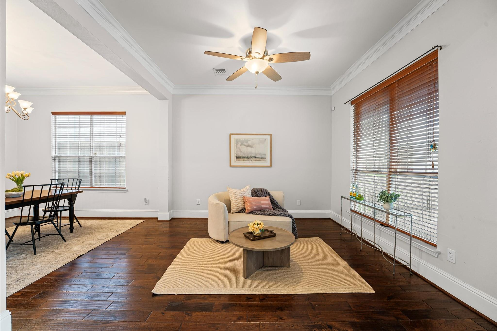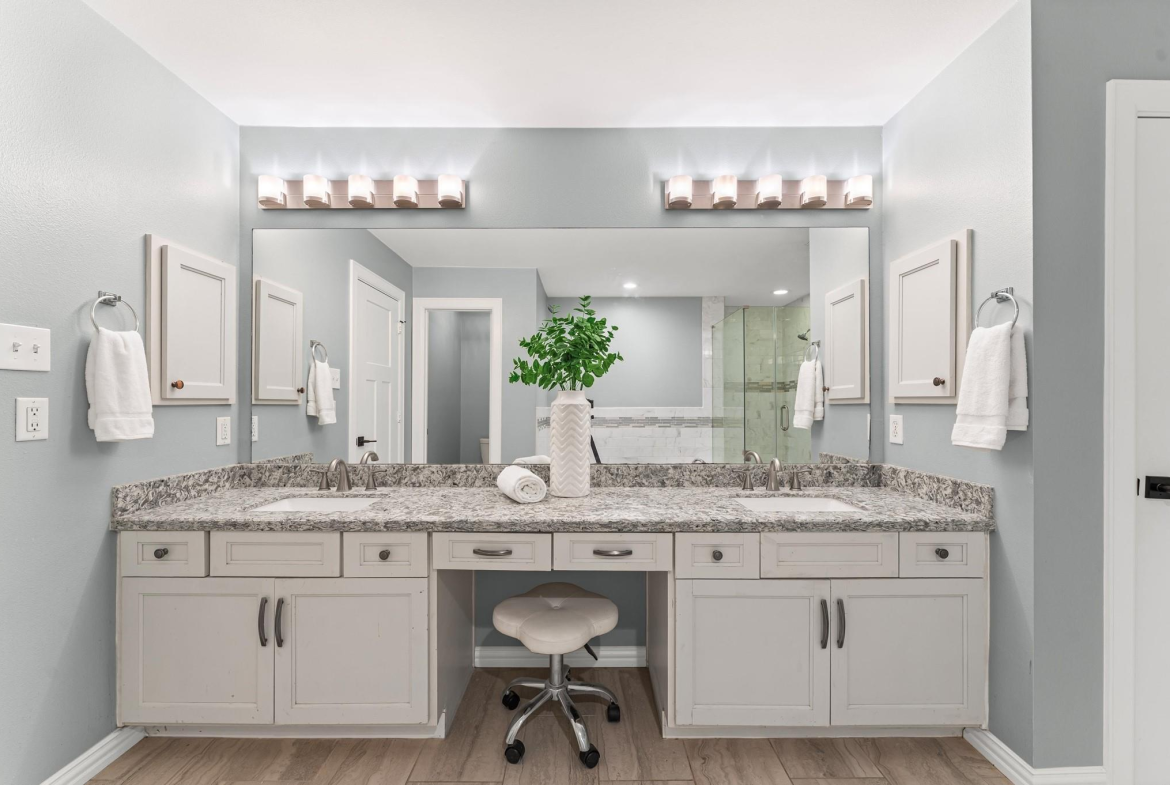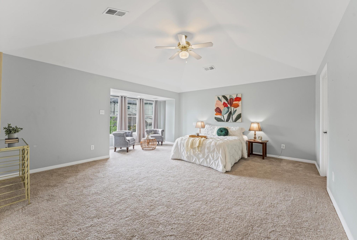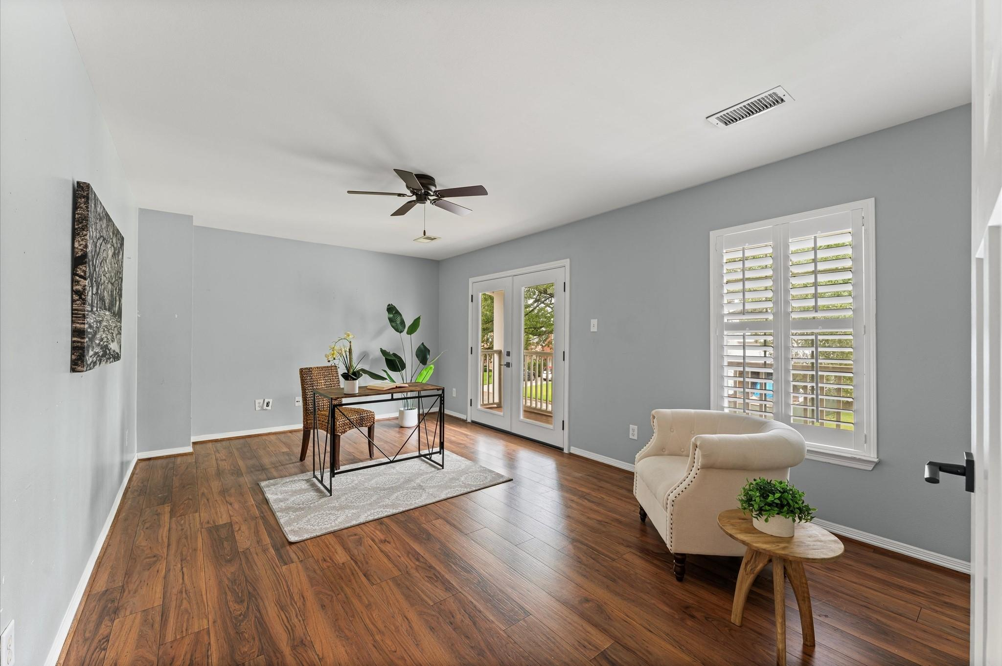 A lovely front porch and upper balcony offer a warm welcome to this gorgeous home. Inside, formal living and dining rooms impress with high ceilings, wood floors, and sleek finishes. A spacious family room features a fireplace with built-ins. It flows into an open kitchen, creating a gathering space ideal for visitors. The kitchen offers granite counters, a gas range, soft-close cabinets, and a large central island. Upstairs, enjoy the primary suite with a vaulted ceiling, a walk-in closet, a jetted tub, and a frameless shower. Three secondary bedrooms include walk-in closets and share a full bath with a separate vanity area. A spacious office can easily serve as a game room or secondary living space where French doors open to the balcony. The backyard boasts an extended patio overlooking a generous lawn – a peaceful setting for outdoor living and entertaining. Call today to see how we can make this house YOUR next home!