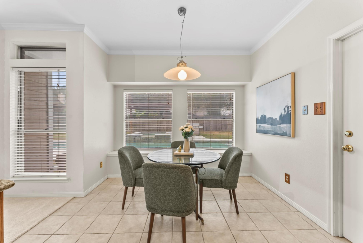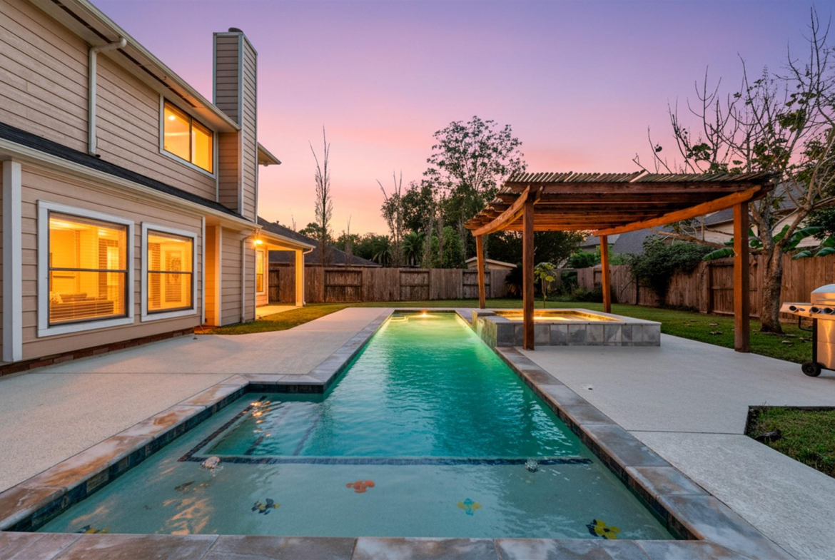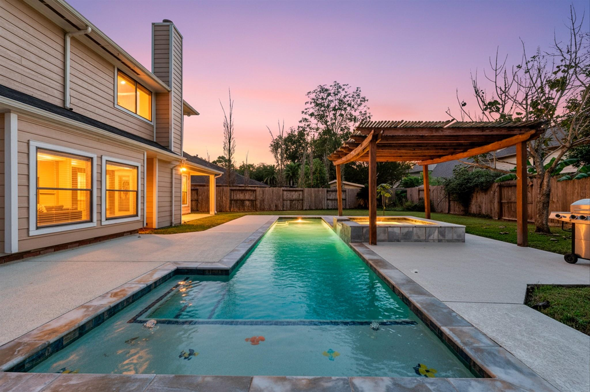 Looking for space, comfort, and a backyard made for fun? This comfortable 2-story home offers a great layout with plenty of space for all. The living room, featuring a brick hearth fireplace, opens to the breakfast room, where a cozy window seat invites morning coffee or afternoon daydreams. The kitchen has granite counters, stainless steel appliances, and a breakfast bar that overlooks the living room. There’s also a formal dining room that could easily be utilized as an office or creative space. Upstairs, a game room with built-in shelves anchors the secondary bedrooms. The split floor plan offers privacy and functionality, with two secondary bedrooms and a shared hall bath on one side, and a spacious primary suite tucked away on the other. The primary bath has two walk-in closets, double sinks, a jetted tub, and a separate shower. Step outside to enjoy a pergola-covered hot tub, a glistening pool, and a large patio, perfect for a relaxing weekend or entertaining guests.
