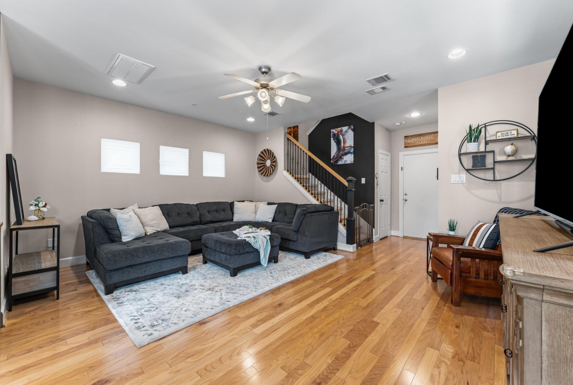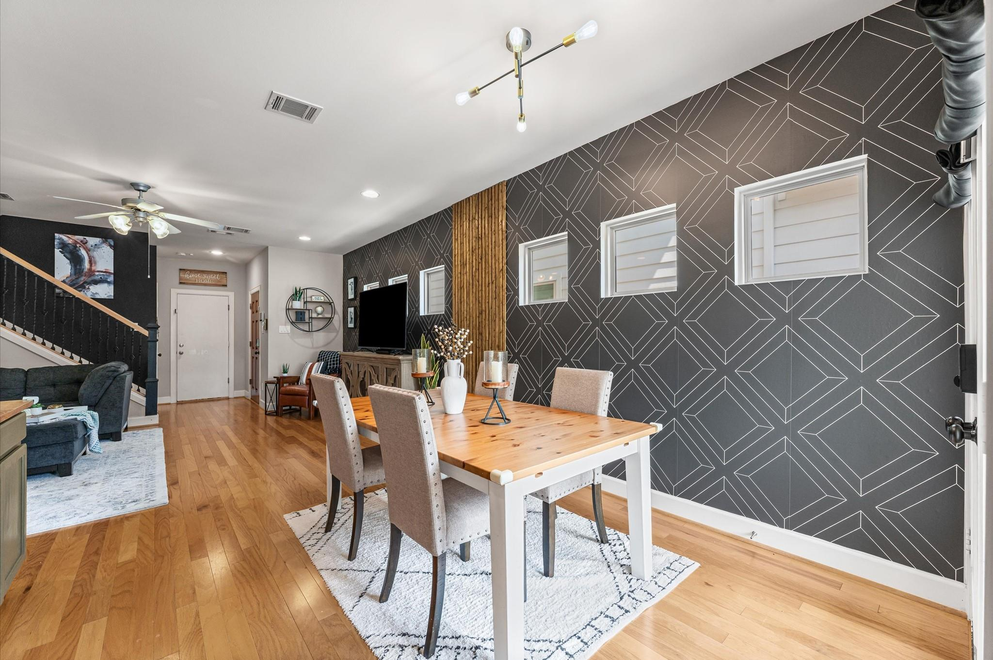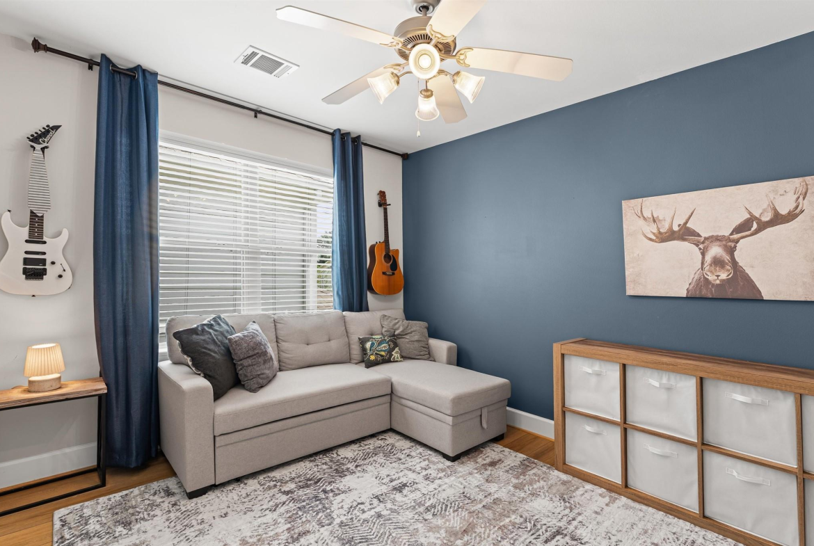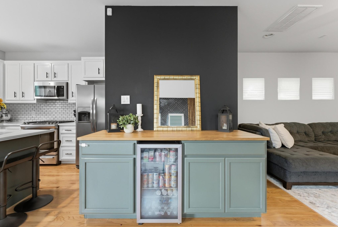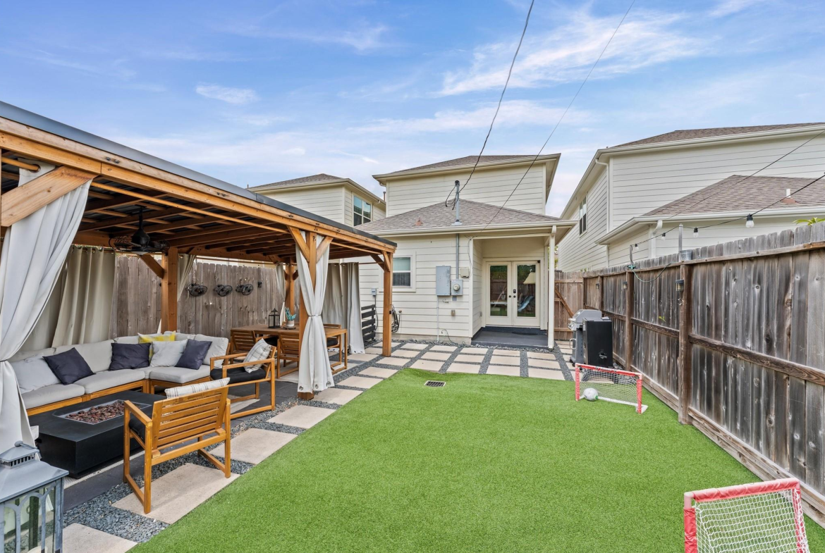 Step into a well-designed home where wood floors flow seamlessly through an open floor plan, creating a warm and welcoming atmosphere. The stylish kitchen is a true centerpiece, featuring a large island, subway tile backsplash, under-cabinet lighting, and a breakfast room that opens to a relaxing living space. Entertaining is effortless with a built-in bar complete with a wine fridge and a convenient half bath nearby. Head upstairs to the primary suite that rests beneath a vaulted ceiling. It offers a spa-like bath with a dual-sink vanity, an oversized tiled shower, and a spacious walk-in closet. Secondary bedrooms are generously sized, each with large walk-in closets, and share a hall bath. A well-planned utility room with counter space and built-in cabinets adds everyday convenience. Outdoors, enjoy year-round living with a large covered patio, artificial turf for low-maintenance beauty, and a climate-controlled outdoor office with its own porch. Working from home never felt better!