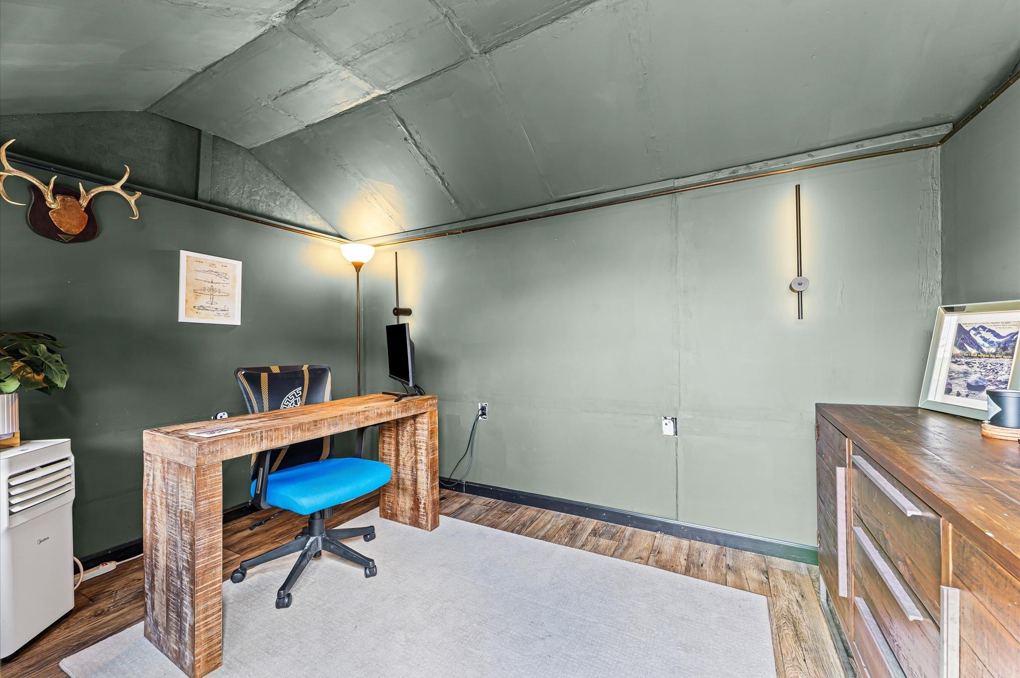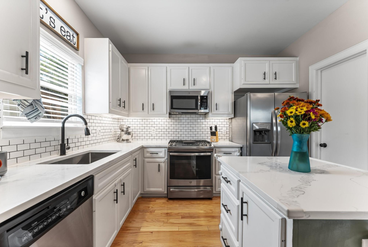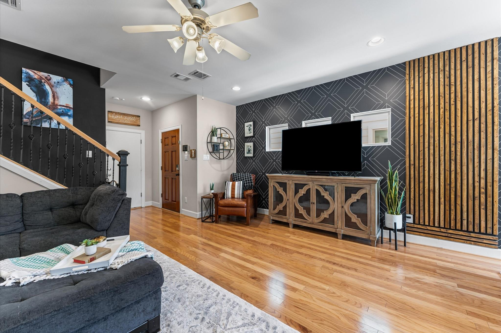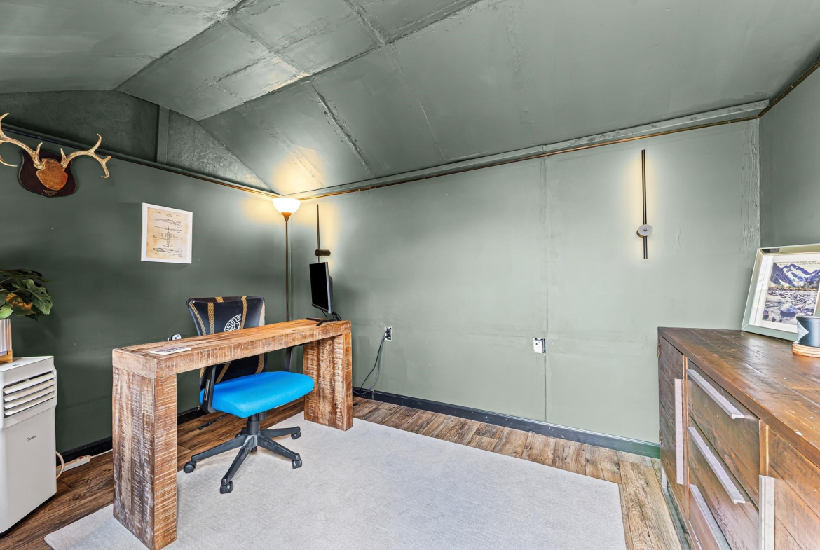 Step into a well-designed home where wood floors flow seamlessly through an open floor plan, creating a warm and welcoming atmosphere. The stylish kitchen is a true centerpiece, featuring a large island, subway tile backsplash, under-cabinet lighting, and a breakfast room that opens to a relaxing living space. Entertaining is effortless with a built-in bar complete with a wine fridge and a convenient half bath nearby. Head upstairs to the primary suite that rests beneath a vaulted ceiling. It offers a spa-like bath with a dual-sink vanity, an oversized tiled shower, and a spacious walk-in closet. Secondary bedrooms are generously sized, each with large walk-in closets, and share a hall bath. A well-planned utility room with counter space and built-in cabinets adds everyday convenience. Outdoors, enjoy year-round living with a large covered patio, artificial turf for low-maintenance beauty, and a climate-controlled outdoor office with its own porch. Working from home never felt better!