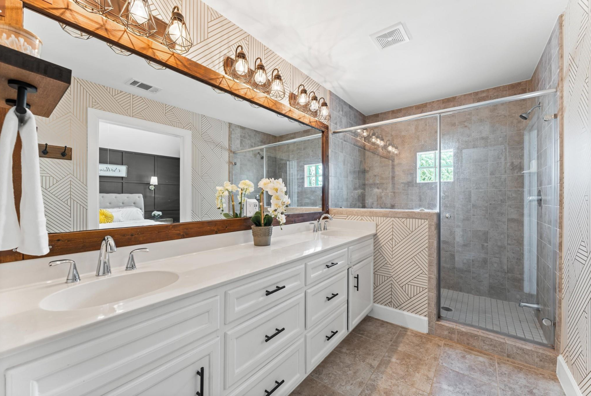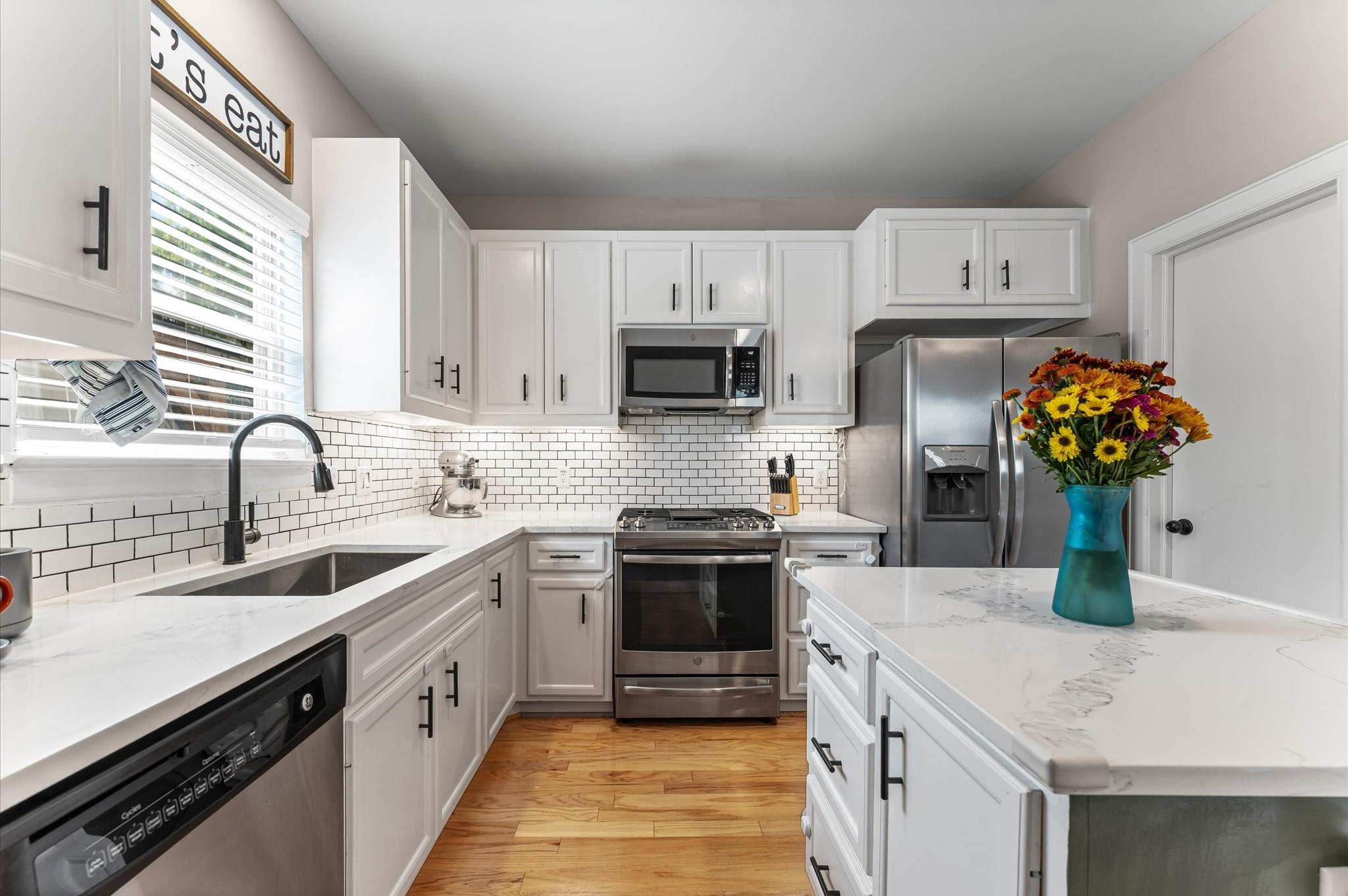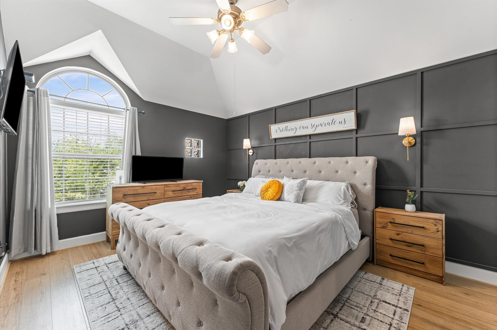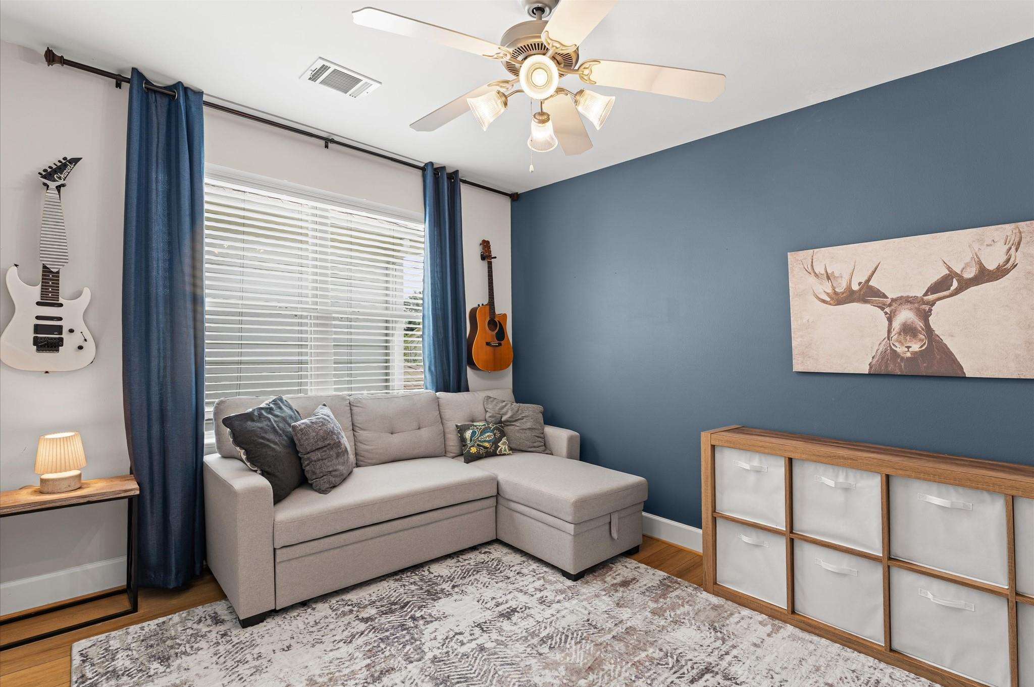Step into a well-designed home where wood floors flow seamlessly through an open floor plan, creating a warm and welcoming atmosphere. The stylish kitchen is a true centerpiece, featuring a large island, subway tile backsplash, under-cabinet lighting, and a breakfast room that opens to a relaxing living space. Entertaining is effortless with a built-in bar complete with a wine fridge and a convenient half bath nearby. Head upstairs to the primary suite that rests beneath a vaulted ceiling. It offers a spa-like bath with a dual-sink vanity, an oversized tiled shower, and a spacious walk-in closet. Secondary bedrooms are generously sized, each with large walk-in closets, and share a hall bath. A well-planned utility room with counter space and built-in cabinets adds everyday convenience. Outdoors, enjoy year-round living with a large covered patio, artificial turf for low-maintenance beauty, and a climate-controlled outdoor office with its own porch. Working from home never felt better!